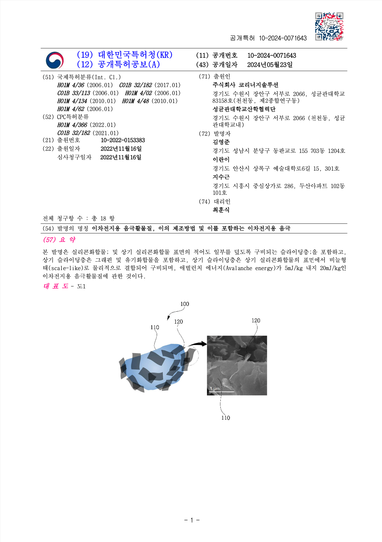 음극재 특허 출원 10-2024-0071643 (2024.05.23)